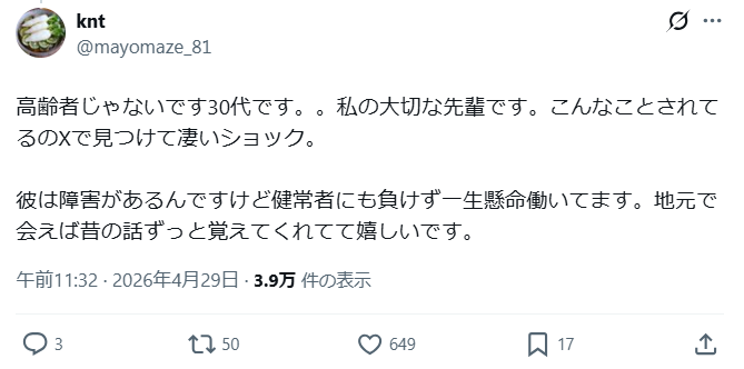 ネット上では「高齢者と思われていたが、30代障害者が本当の情報」と言ったコメントも見られます。