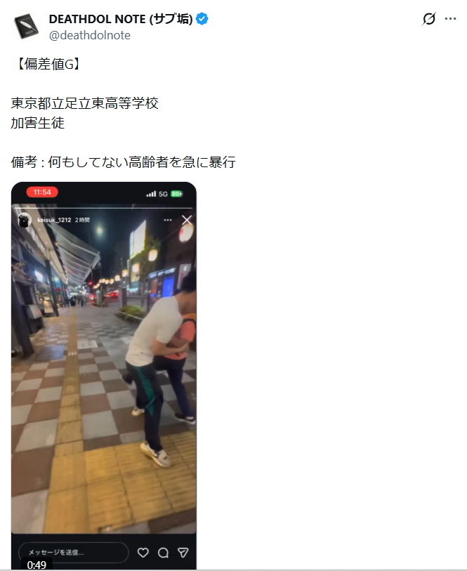 - 足立東高校の生徒という情報や、生徒の名前特定情報はSNS中心で未確認