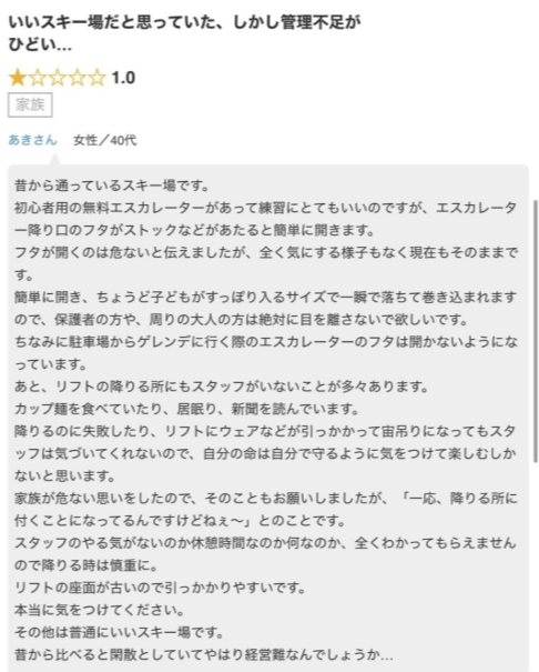朝里川温泉スキー場のエスカレーターについては、以前からじゃらんの口コミに「フタが空いて危険」と言う内容があったことが話題となっています。その場のスタッフに話しても対応してくれなかったそうです。もし対応してくれていれば、今回の事故は起きなかったかもしれません。