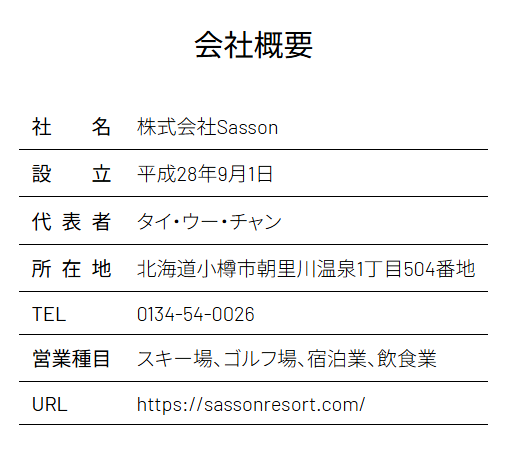 Sassonリゾートは北海道小樽市にあるリゾート会社で、スキー・温泉・宿泊・ゴルフ・飲食など様々なエンタメが集合しているレジャー施設です。