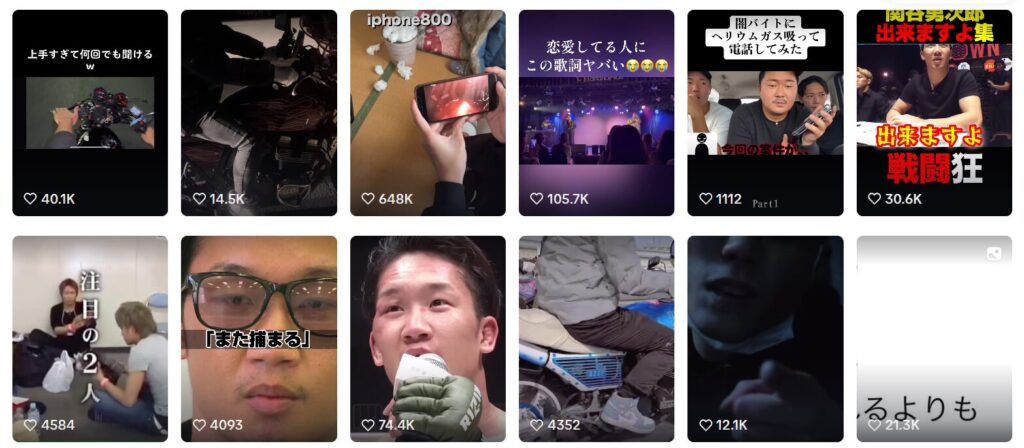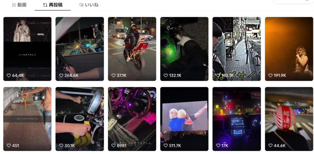 栗屋樹さんのTikTokでは、リール投稿の欄は主に「車やバイク」などの投稿が多いので興味関心が大きいことがわかります。朝倉未来さんの投稿もあるので、「格闘技やブレイキングダウン」についても興味関心が大きいのではないかと思われます。