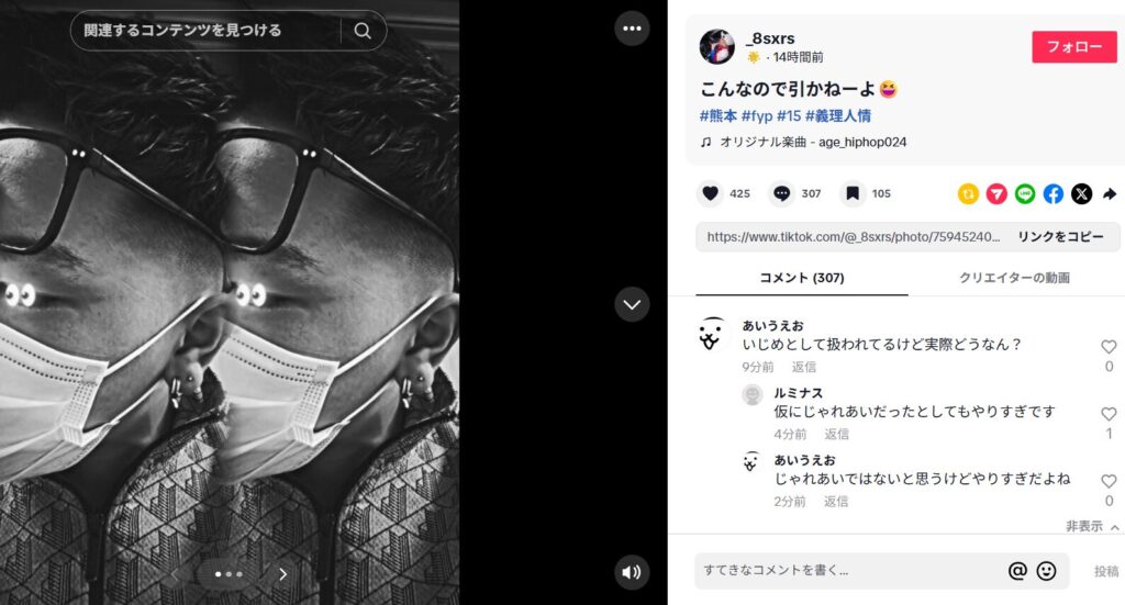 栗屋樹さんのTikTokは、インスタと同じアカウント名である「_8sxrs」とされています。
