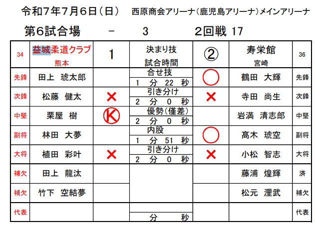 また2025年に行われたマルちゃん杯九州少年柔道大会では、益城柔道クラブで中堅として出場し、優勢の状態で相手の棄権勝ちを収めています。