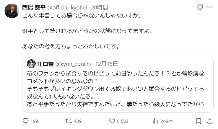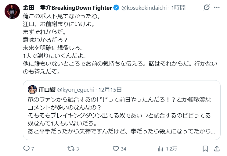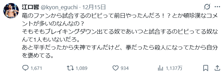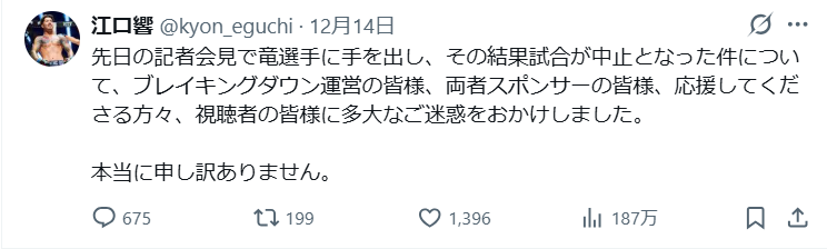 なお、ビンタをした側である江口響選手は、SNSでこのようにコメントしています。