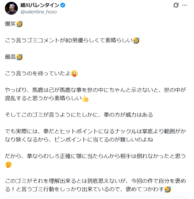 この騒動には細川バレンタインさんも参戦。下からブレイキングダウンを批判する立場にある細川バレンタインさんですが、今回の騒動に関してもコメントされています。ブレイキングダウンに参戦している選手とは、Xでいつも舌戦を繰り広げていますね。