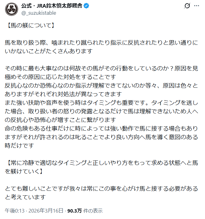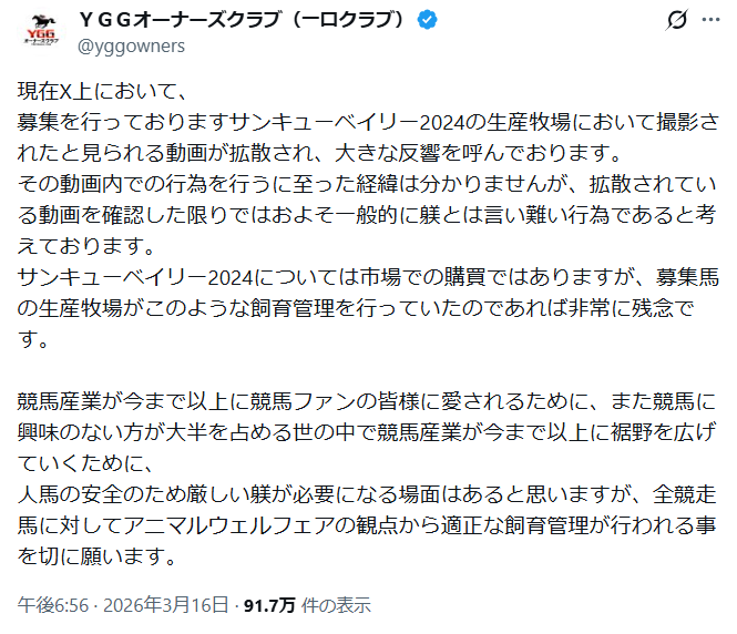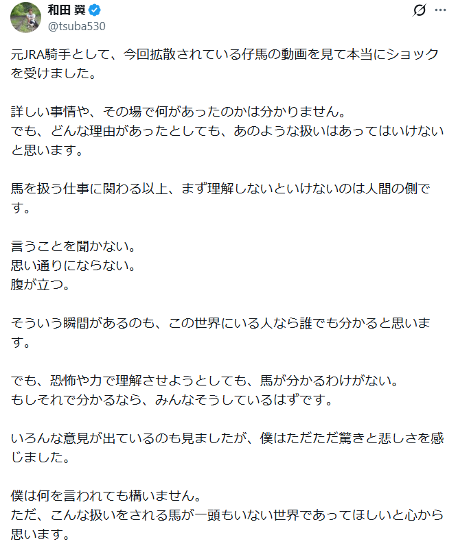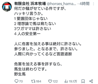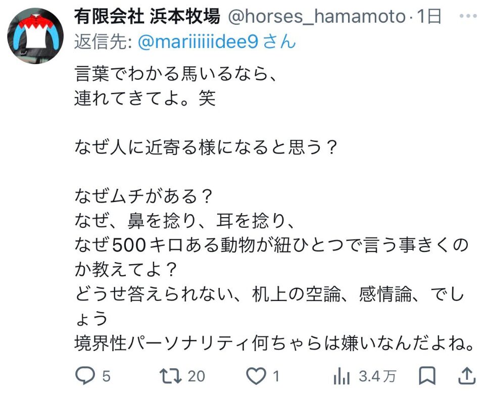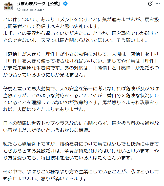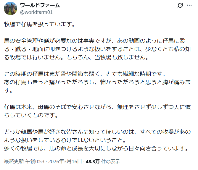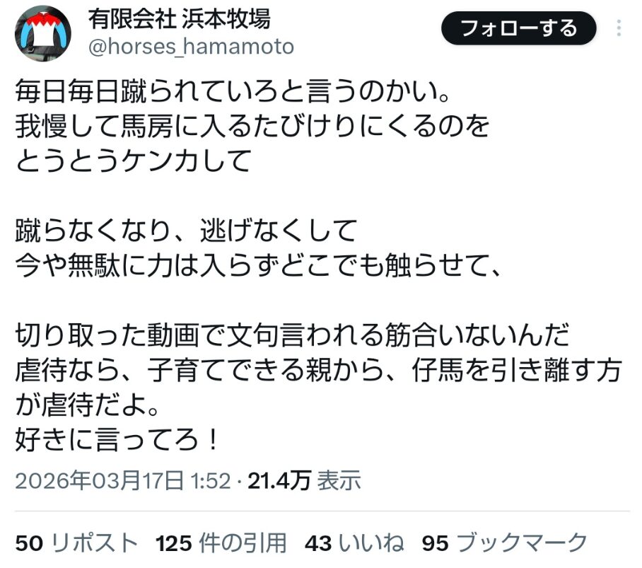これに対し浜本牧場はXで「馬の教育上仕方のないこと」とされるコメントを投稿しています。