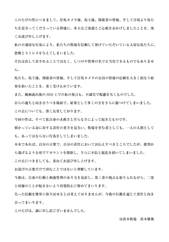 その後、動画が配信された「仔馬カメラ」の元に、浜本牧場の4代目である濱本雅俊さんから謝罪文が届きました。