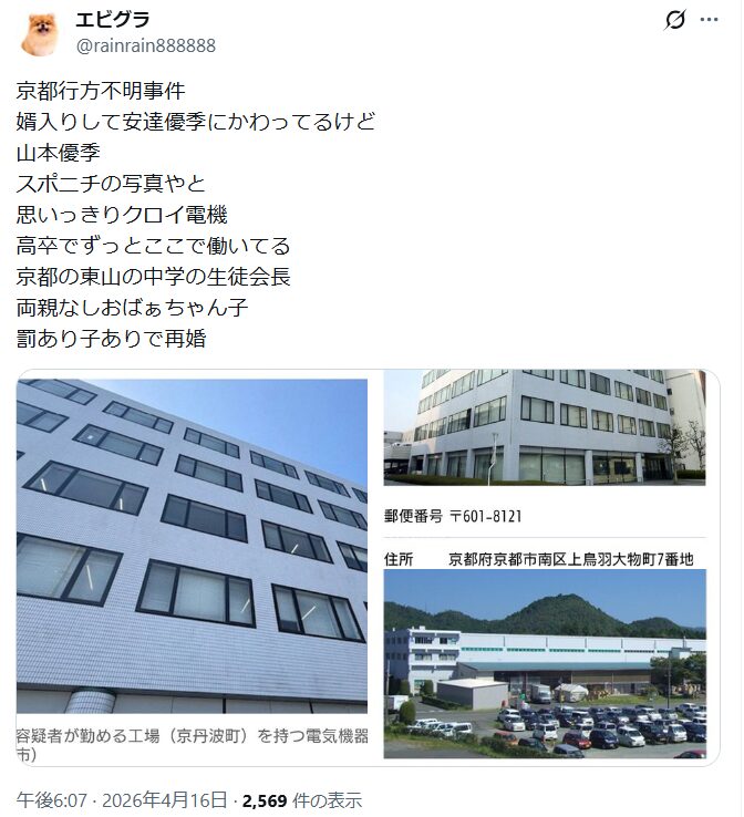 - 京丹波の工場で働き、安達優季容疑者と出会った