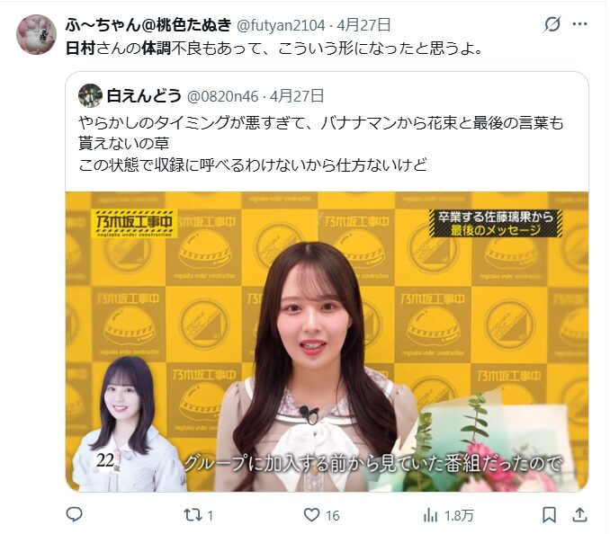 バナナマンがMCを務める「乃木坂工事中」では、佐藤瑠果さんが卒業を発表しましたが、その際に花束の贈呈やトークが無かった事が一部で話題となりました。