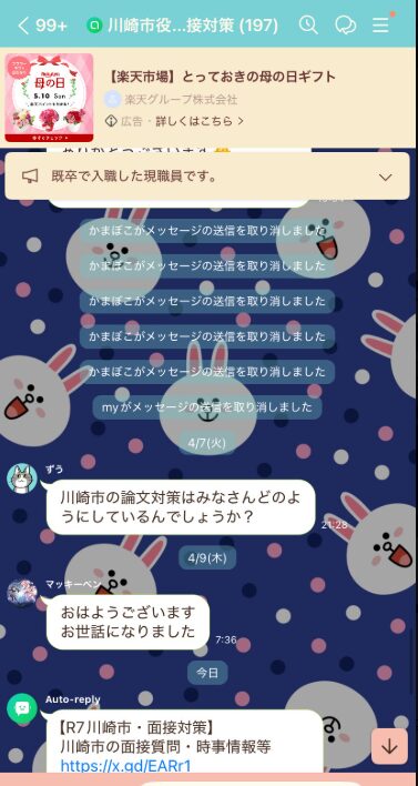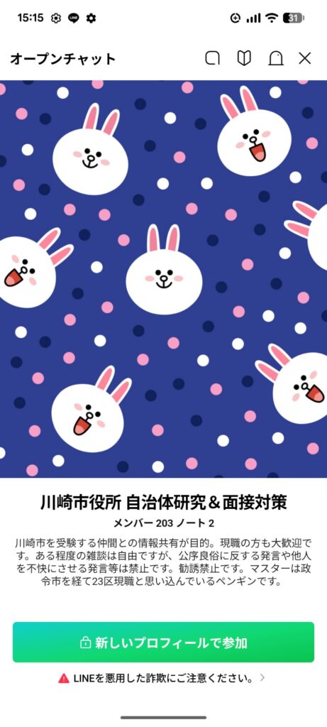 恐らく会社公認のLINEアカウントではなく、川崎市役所を受験する学生たちによる情報交換のためのアカウントだと思われます。