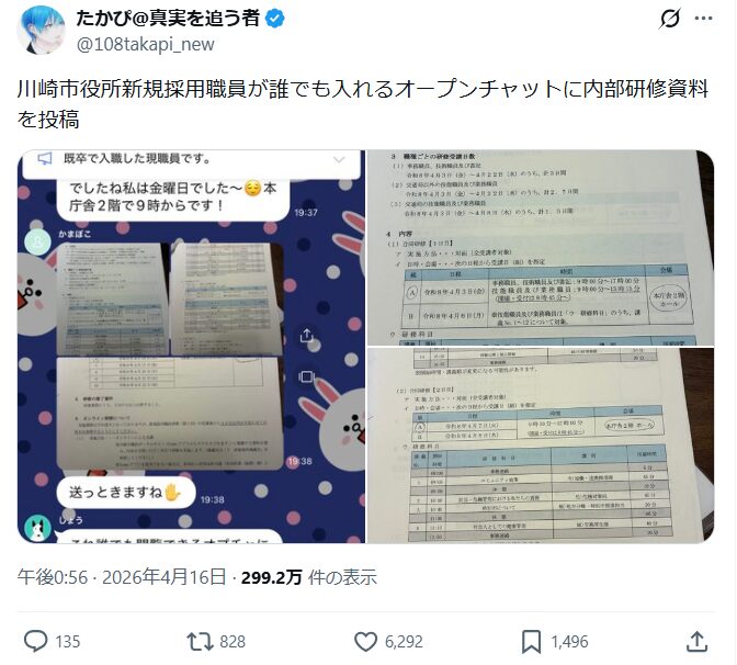 今回起きた事件は、川崎市の新規採用職員が、LINEのオープンチャットに研修用資料の写真を投稿していたというものです。写真は外部に広がり、Xにも転載される事態になりました。