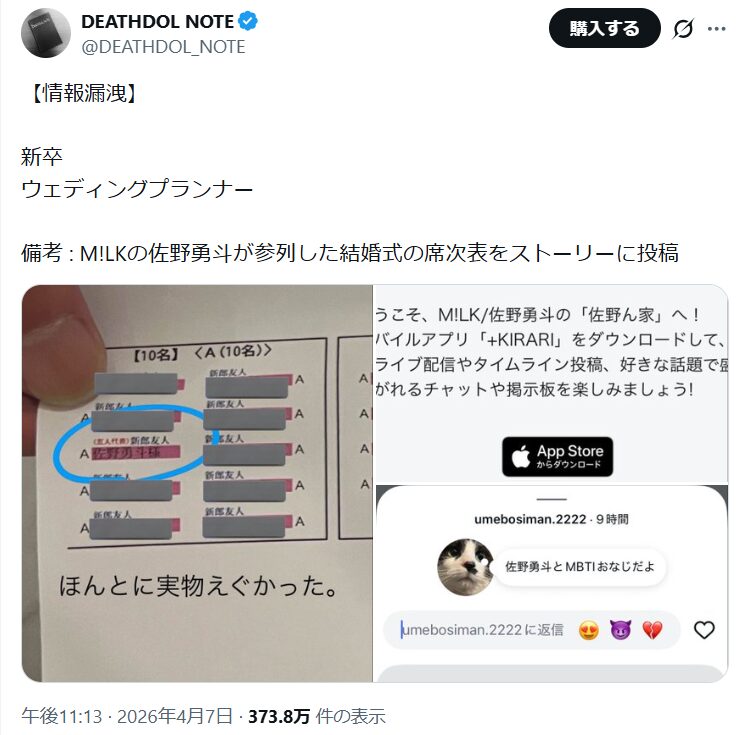 M!LKの佐野勇斗が参列したとされる結婚式で、席次表の画像がSNSに投稿され炎上しています。